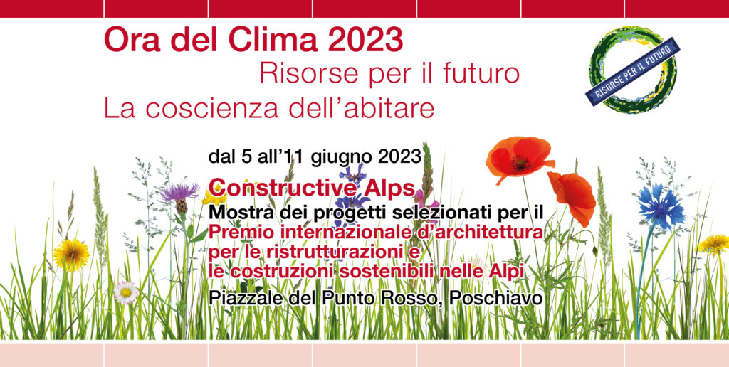Risorse per il futuro – La coscienza dell’abitare In occasione della Giornata mondiale dell’ambiente del 5 giugno 2023, il Polo Poschiavo, con il sostegno dell’Ufficio Federale dello Sviluppo Territoriale ARE, organizza la terza edizione dell’Ora del Clima e presenta la mostra dei progetti selezionati per il Premio internazionale di architettura “Constructive Alps”. Torna per la terza volta […]