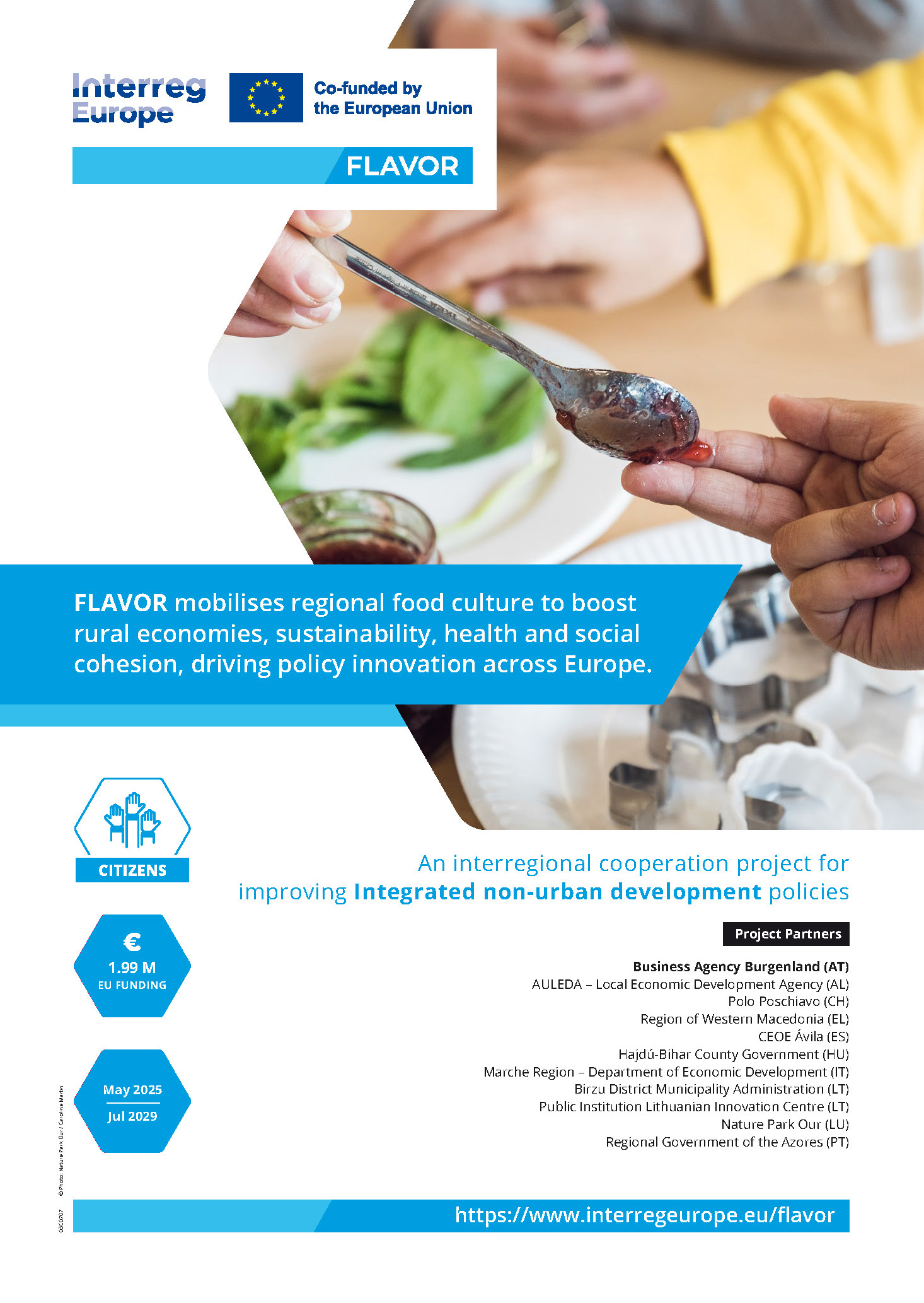 Il progetto FLAVOR promuove una nuova visione del cibo e del paesaggio come patrimonio vivente delle aree rurali europee. Finanziato dal programma Interreg Europe, mira a migliorare le politiche pubbliche per valorizzare la cultura alimentare locale, i paesaggi produttivi e il legame tra comunità, ambiente e saperi tradizionali.